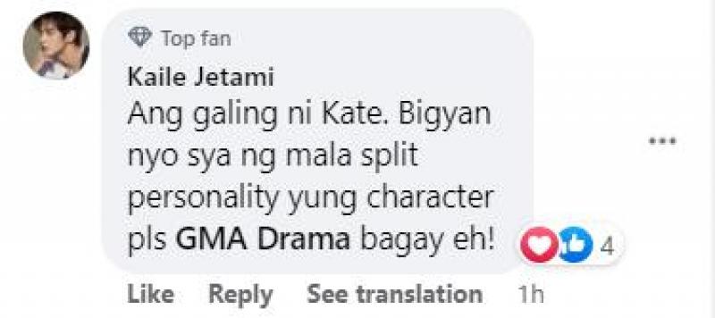 "Ang galing ni Kate. Bigyan n'yo s'ya ng mala-split personality 'yung character pls. GMA Drama bagay eh!" Kaile Jetami wrote.