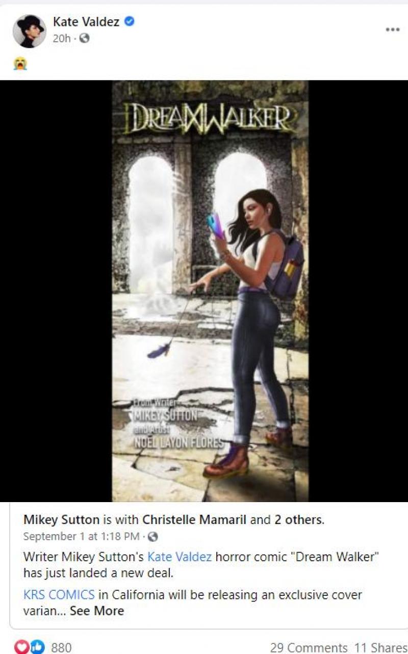Filipino-American journalist Mikey Sutton announced on social media that Kapuso actress Kate Valdez's horror comic book titled Dream Walker will be having an exclusive cover variant.
