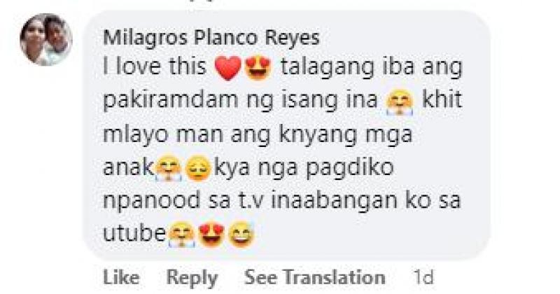 "Love this…talagang iba ang pakiramdam ng isang ina…khit mlayo man ang knyang mga anak…kya nga pagdiko npanood sa t.v inaabangan ko sa utube..." komento ng Facebook user na may pangalang Milagros Planco Reyes.