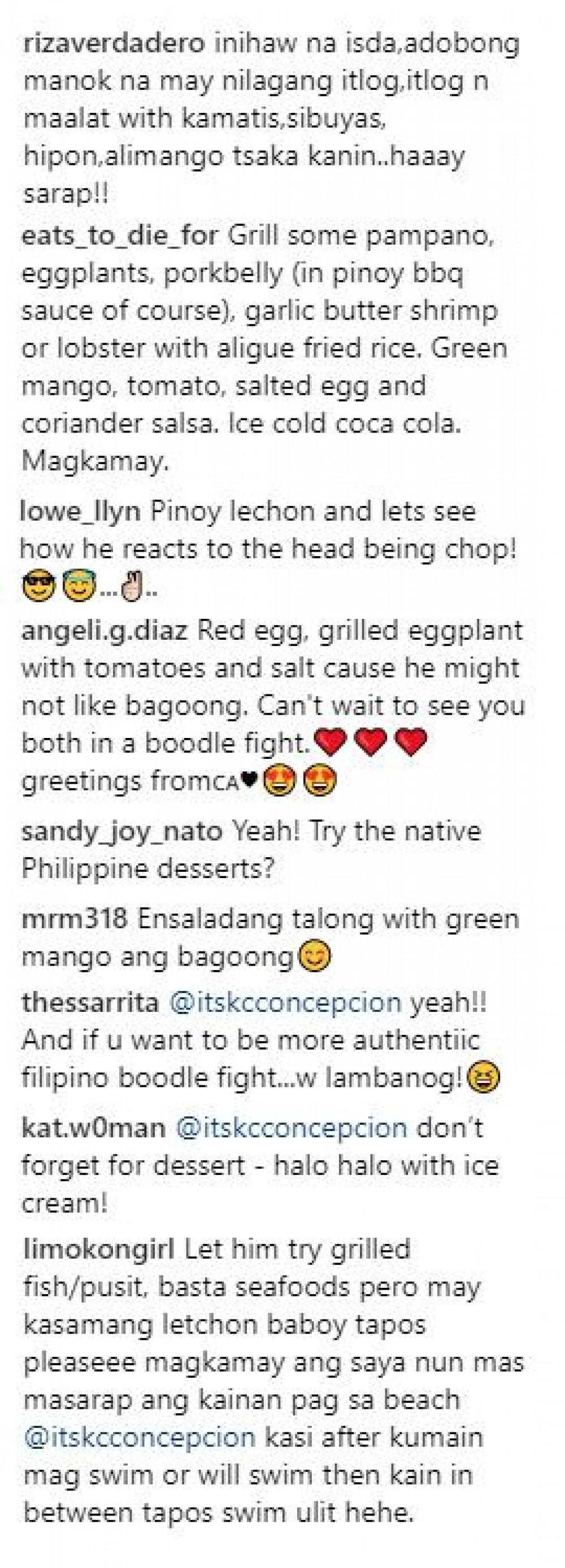She wrote: "He has to try a homecooked 'boodle fight' on fresh banana leaves with inihaw!!! Hahah Pinoy style, BUT with French wine (and maybe some Philippine mango rum!) of course."