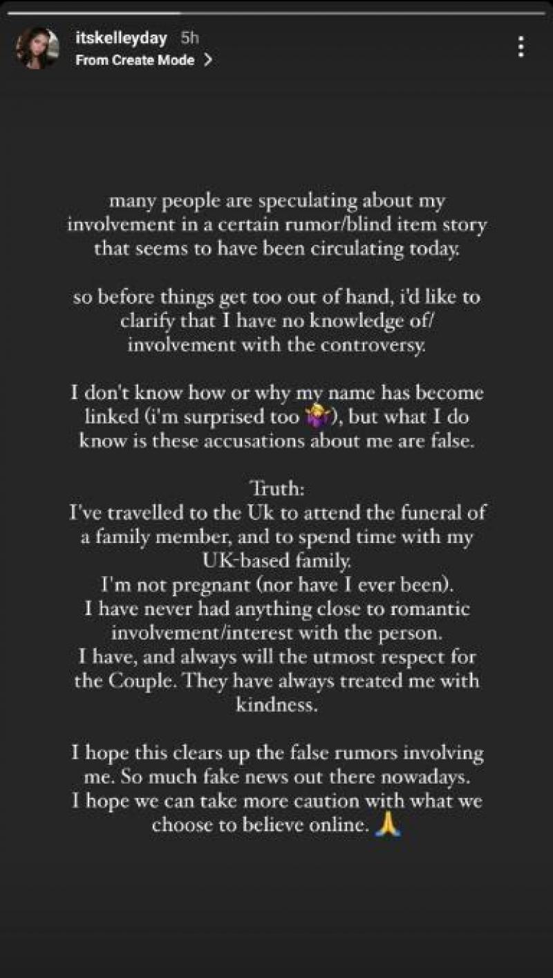 In a statement she posted on her Instagram Story, Kelly wrote, "Many are speculating about my involvement in a certain rumor/blind item story that seems to have been circulating today.