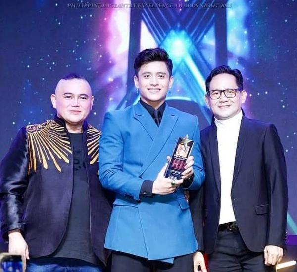 Masayang tinanggap ni Kelvin Miranda ang Teen Actor of the Year award mula sa Best Awards founder Richard Hiñola (left) at Mel Caparas.