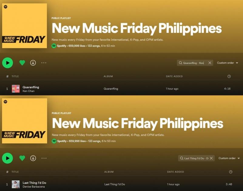 Ken Chan's sophomore single "Quaranfling" and Denise Barbacena's new song "Last Thing I'd Do" made it to Spotify Philippines New Music Friday playlist this week!