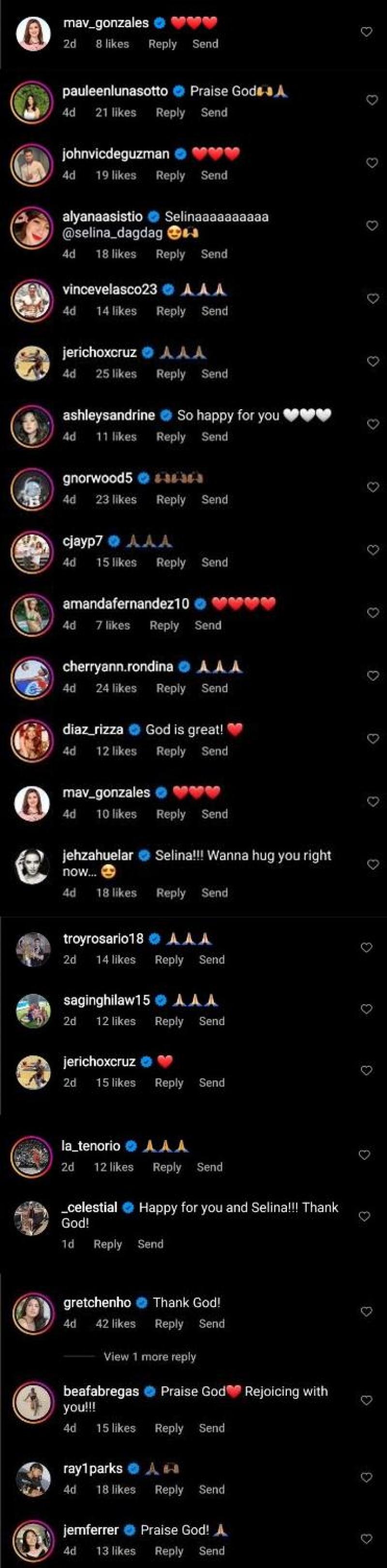 Many celebrities and sports personalities were ecstatic after hearing the news of Selina's recovery including Kapuso news reporter Mav Gonzales, Eat Bulaga host Pauleen Luna, Sparkle talent John Vic de Guzman, to name a few.