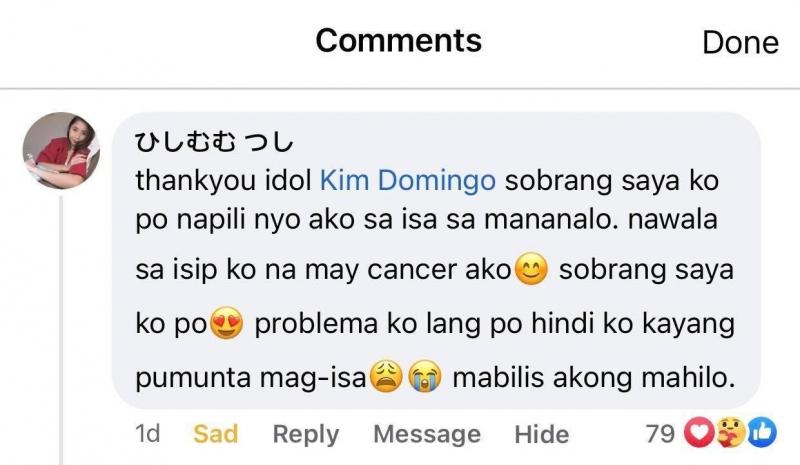 Mababasa sa comment ng babae, “Thank you idol Kim Domingo. Sobrang saya ko po napili n'yo ako sa isa sa mananalo. Nawala sa isip ko na may cancer ako. Sobrang saya ko po. Problema ko lang po hindi ko kayang pumunta mag-isa, mabilis akong mahilo.”