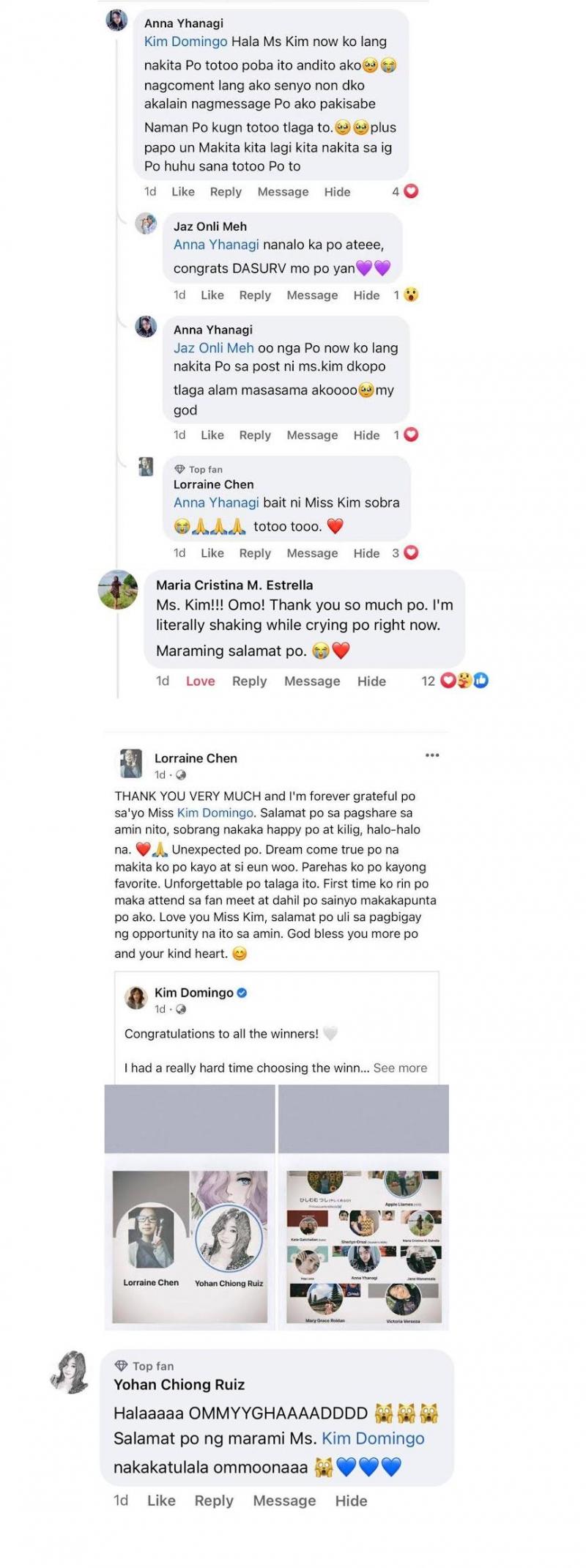 Ang netizens naman na sina Anna Yhanagi, Lorraine Chen, Maria Cristina Estrella, at Yohan Chiong Ruiz, natulala raw at hindi makapaniwalang kabilang sila sa mga napili ng aktres na bigyan ng fan meet tickets.