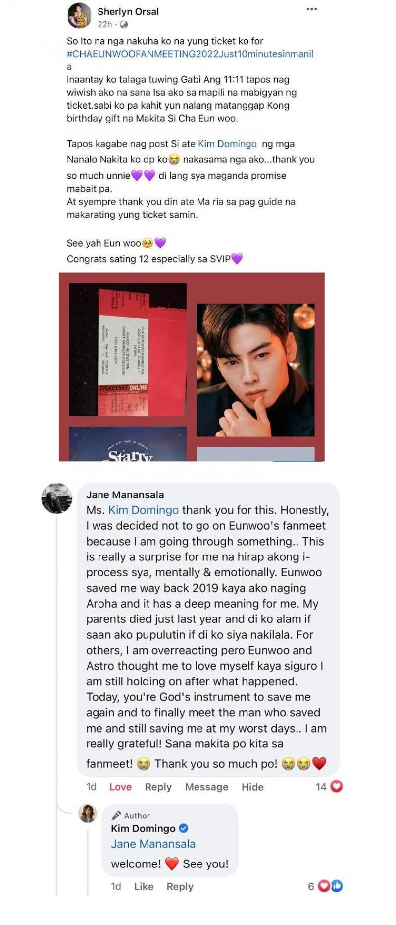 Matapos ianunsyo ni Kim Domingo sa social media ang makatanggap ng fan meet tickets para sa nalalapit na pagbisita ni Cha Eun Woo sa Pilipinas, sunud-sunod na mensahe ang kaniyang natanggap mula sa fans ng Korean actor.