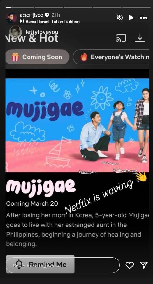 In one of his more recent Instagram Story, Ji Soo uploaded a screenshot showing that the film he starred in, Mujigae, is set to make its debut on streaming giant Netflix on March 20. Included in the screenshot is a caption that reads “Netflix is waving” along with a hand waving emoji.