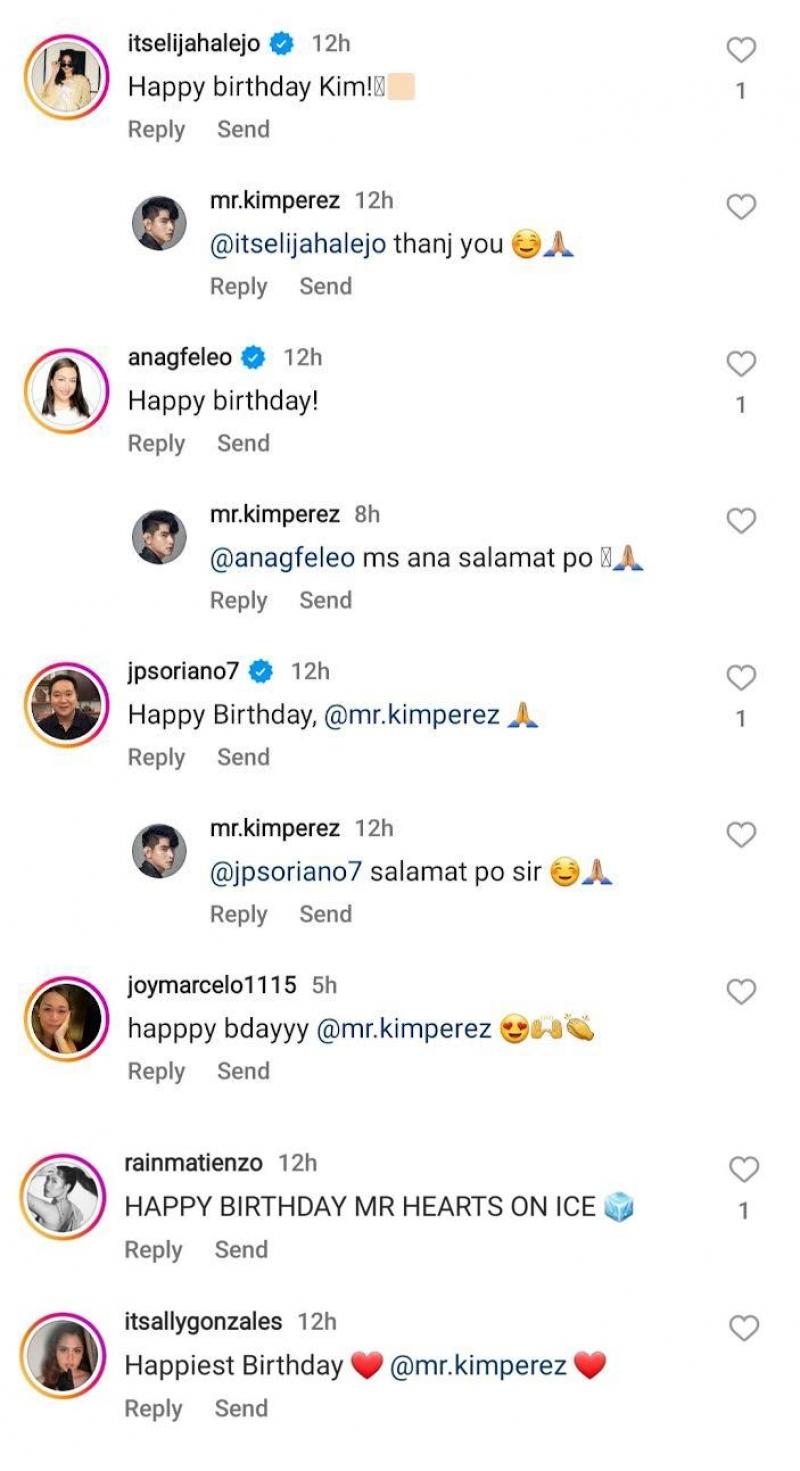 Ilan sa celebrities na nagpaabot ng pagbati kay Kim ay sina Elijah Alejo, Ana Feleo, Rain Matienzo, at Ally Gonzales.