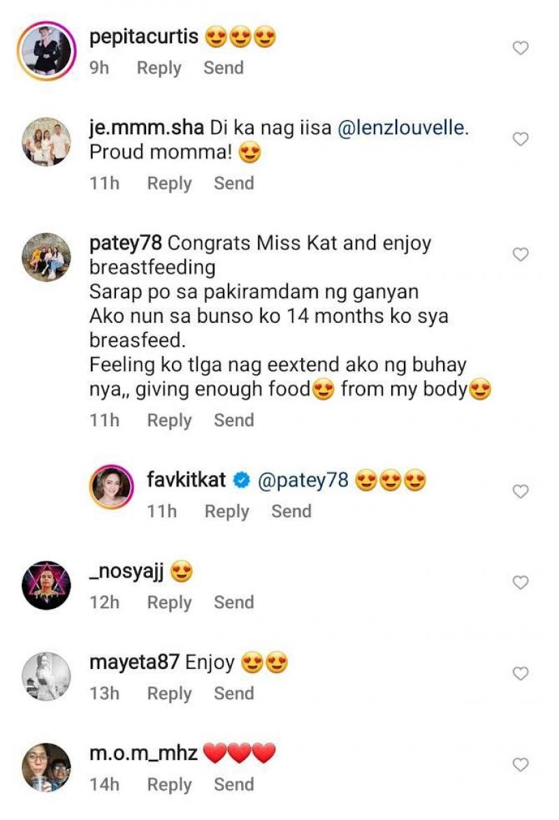 “Congrats Miss Kat and enjoy breastfeeding. Sarap po sa pakiramdam ng ganyan. Ako nun sa bunso ko 14 months ko siya breastfeed. Feeling ko tlga nag eextend ako ng buhay nya,, giving enough food😍 from my body😍” @patey78 commented.