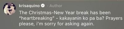 “The Christmas-New Year break has been 'heartbreaking' - kakayanin ko pa ba? Prayers please, I'm sorry for asking again,” she wrote.