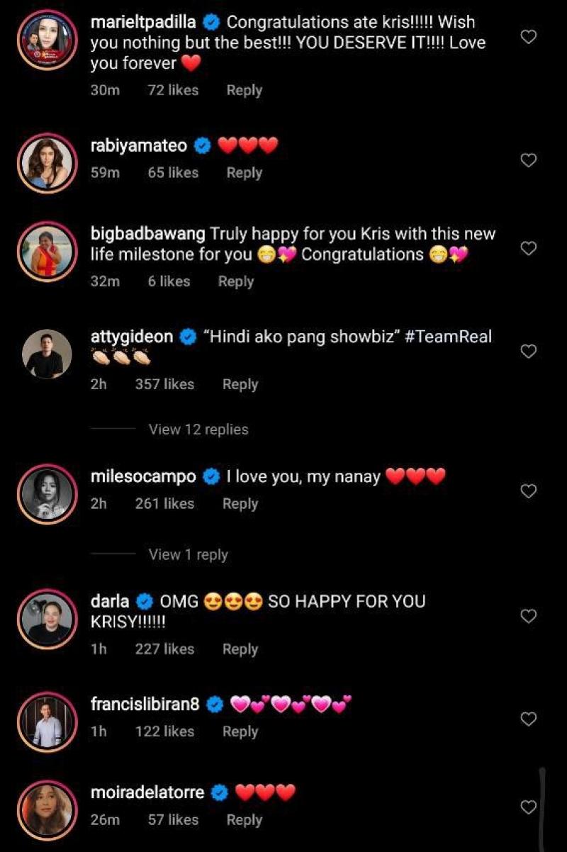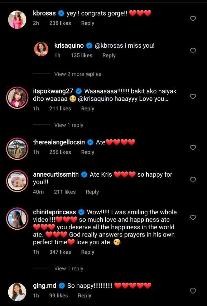 Bagamat hindi niya tuwirang binanggit kung engaged na sila ng dating DILG secretary, bumuhos naman ang congratulatory messages para kay Kris mula sa kanyang kaibigan at sa showbiz.