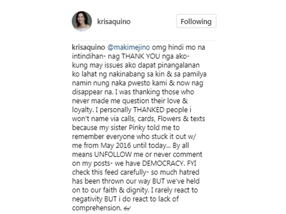 “OMG hindi mo naintindihan – nag thank you nga ako – kung may issues ako dapat pinangalanan ko lahat ng nakinabang sa akin at sa pamilya namin nung nakapwesto kami and now nag-disappear na. I was thanking those who never made me question their love and loyalty. I personally thanked people I won’t name via calls, cards, flowers and texts because my sister Pinky told me to remember everyone who stuck it out with me from May 2016 until today,” Kris said.