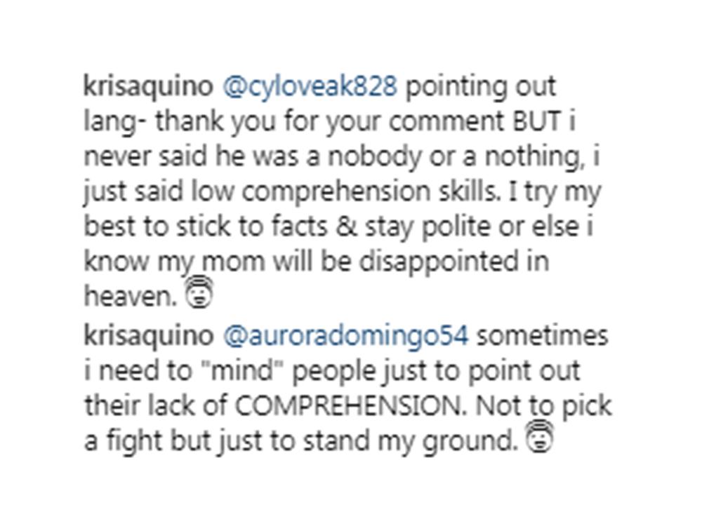 Kris also clarified her response to her other followers, politely defending herself and staying her ground so as not to disappoint her deceased mother, the former President Corazon Aquino.
