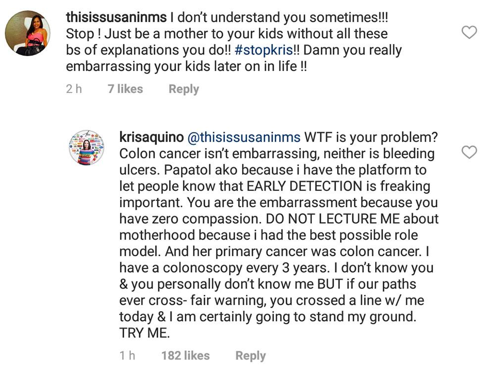 “WTF is your problem? Colon cancer isn’t embarrassing, neither is bleeding ulcers. Papatol ako because I have the platform to let people know that EARLY DETECTION is freaking important. You are the embarrassment because you have zero compassion. DO NOT LECTURE ME about motherhood because I had the best possible role model, and her primary cancer was colon cancer,” she angrily told @thisisusanims on Instagram.