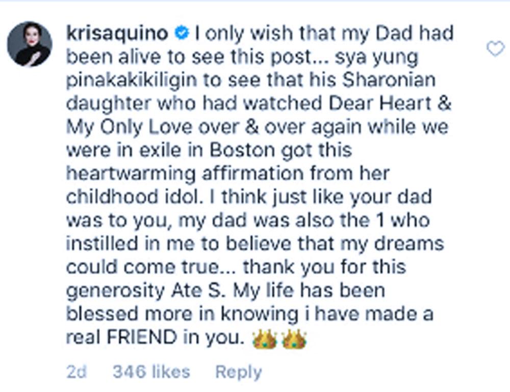Saad ni Kris, “I think just like your dad was to you, my dad was also the one who instilled in me to believe that my dreams could come true. Thank you for this generosity Ate S. My life has been blessed more in knowing I have made a real friend in you.”