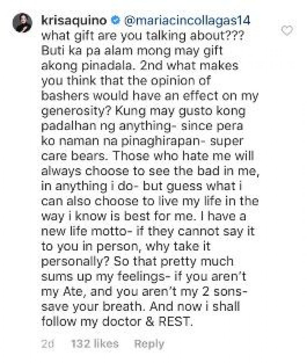 “What gift are you talking about??? Buti ka pa alam mong may gift akong pinadala,” ang sagot ni Kris sa komento ng nasabing netizen.