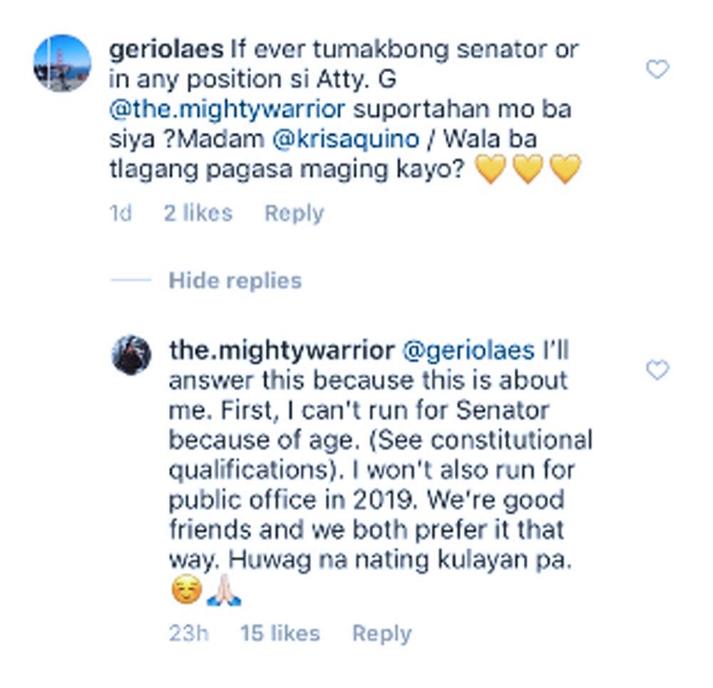 Netizen @geriolaes asked Kris if she will support Atty. Peña if he decides to run for the Senate in the 2019 elections.