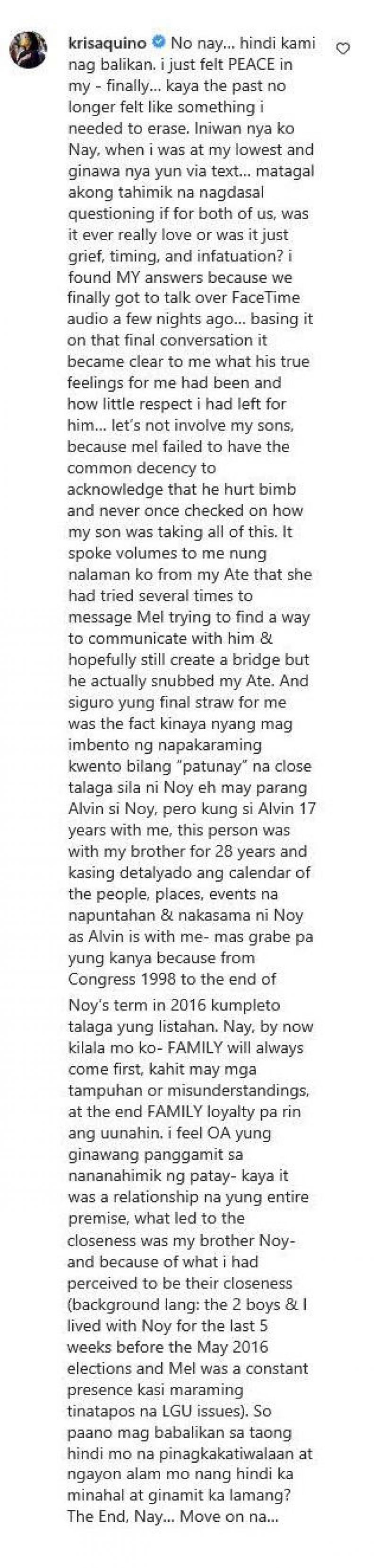 "And siguro yung final straw for me was the fact kinaya nyang mag imbento ng napakaraming kwento bilang “'patunay' na close talaga sila ni Noy eh may parang Alvin si Noy, pero kung si Alvin 17 years with me, this person was with my brother for 28 years and kasing detalyado ang calendar of the people, places and events na napuntahan & nakasama ni Noy as Alvin is with me…" she said.