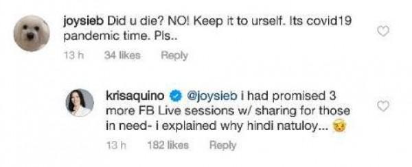 To which Kris responded, “I had promised 3 more FB live sessions with sharing for those in need--I explained why hindi natuloy.”