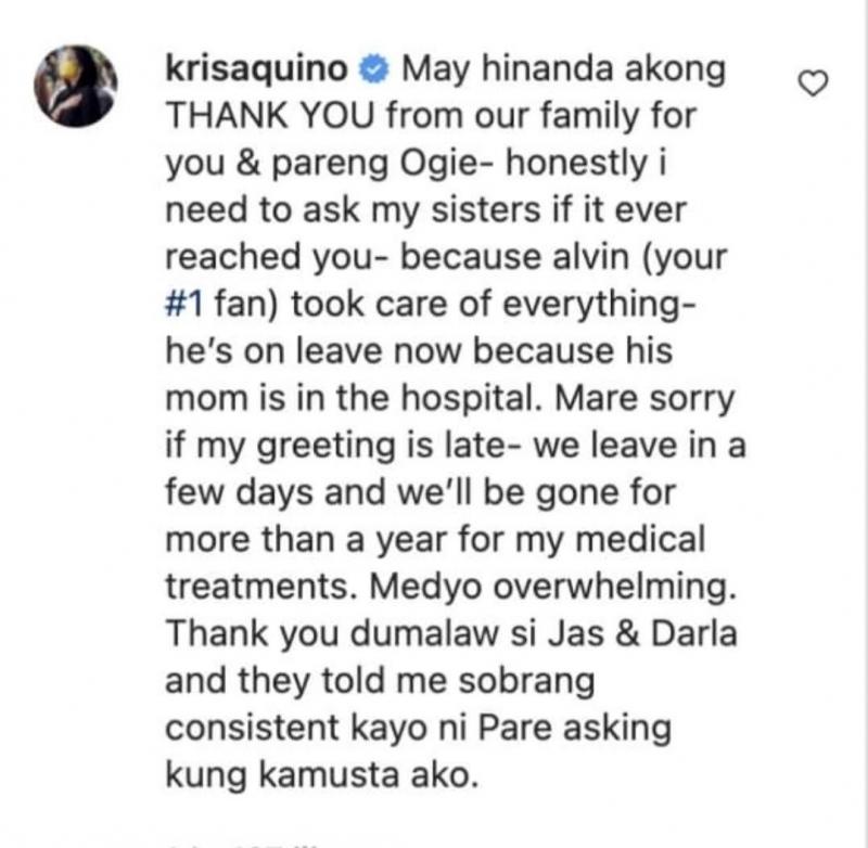 “Mare sorry if my greeting is late -- we leave in a few days and we'll be gone for more than a year for my medical treatments. Medyo overwhelming,” Kris said.