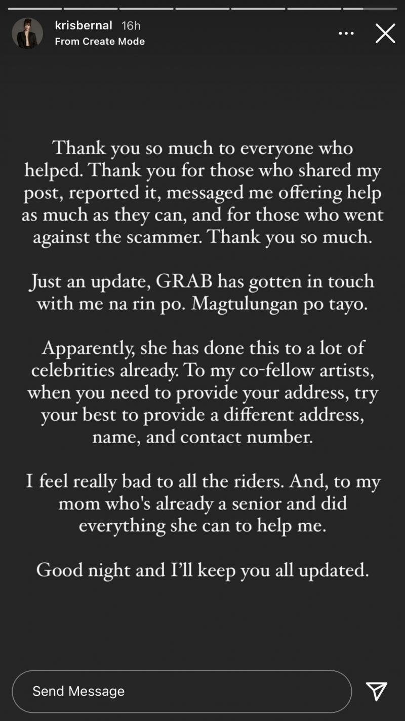 Sa kanyang Instagram story, inilahad ng aktres na nakikipag-ugnayan na sa kanya ang delivery app na Grab Philippines ukol sa insidente.