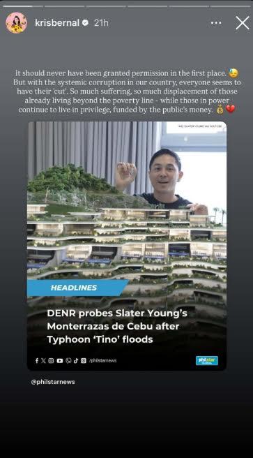 On Instagram Stories, the Kapuso actress expressed her frustration over Slater Young's hillside project, The Rise at Monterrazas, which she believes may have contributed to the intense flooding in Cebu.