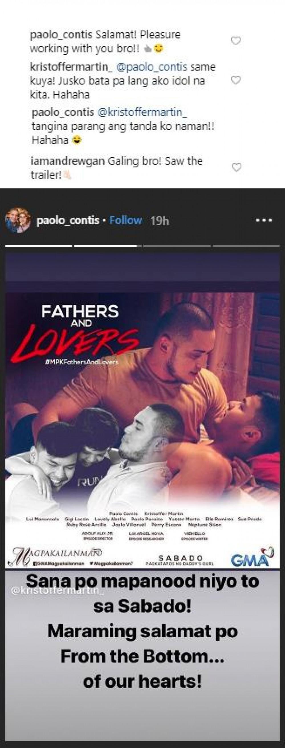 “Eto naaaaa. Panuorin po natin ngayong darating na Sabado sa Magpakailanman: “Fathers and Lover”, kwento ng pagmamahalan at pagbibigay importansya sa pamilya. Iba ka dito @paolo_contis ! Hahaha. Solid ka brader! Directed by: @aalixjr”