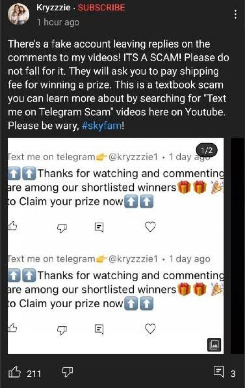 After celebrating her Gold Play Button award, content creator and lifestyle vlogger Kryz Uy took to the community section of her YouTube channel to warn her subscribers against scammers.