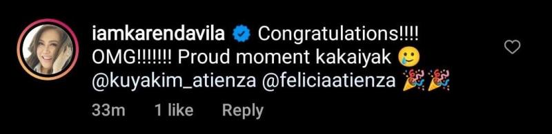 Broadcast journalist Karen Davila also sent her congratulatory message for Kuya Kim's beloved child saying “Congratulations!! OMG!! Proud moment kakaiyak @kuyakim_atienza @feliciaatienza.”