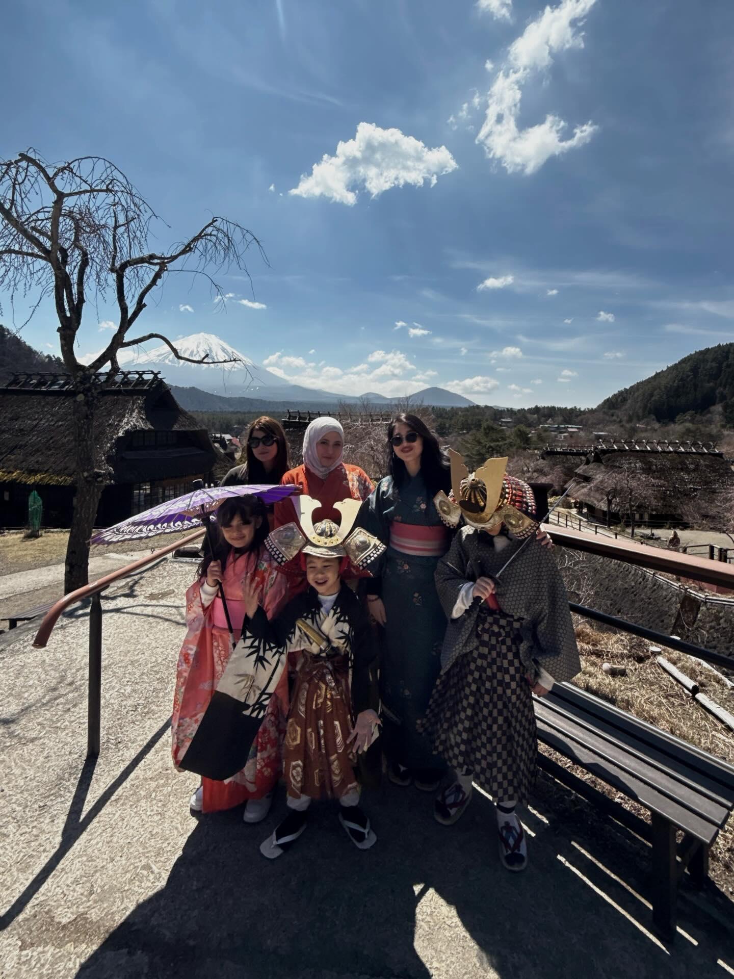 She reunited with her sisters Queenie and Zhen while they toured a traditional Japanese village wearing colorful kimonos.
