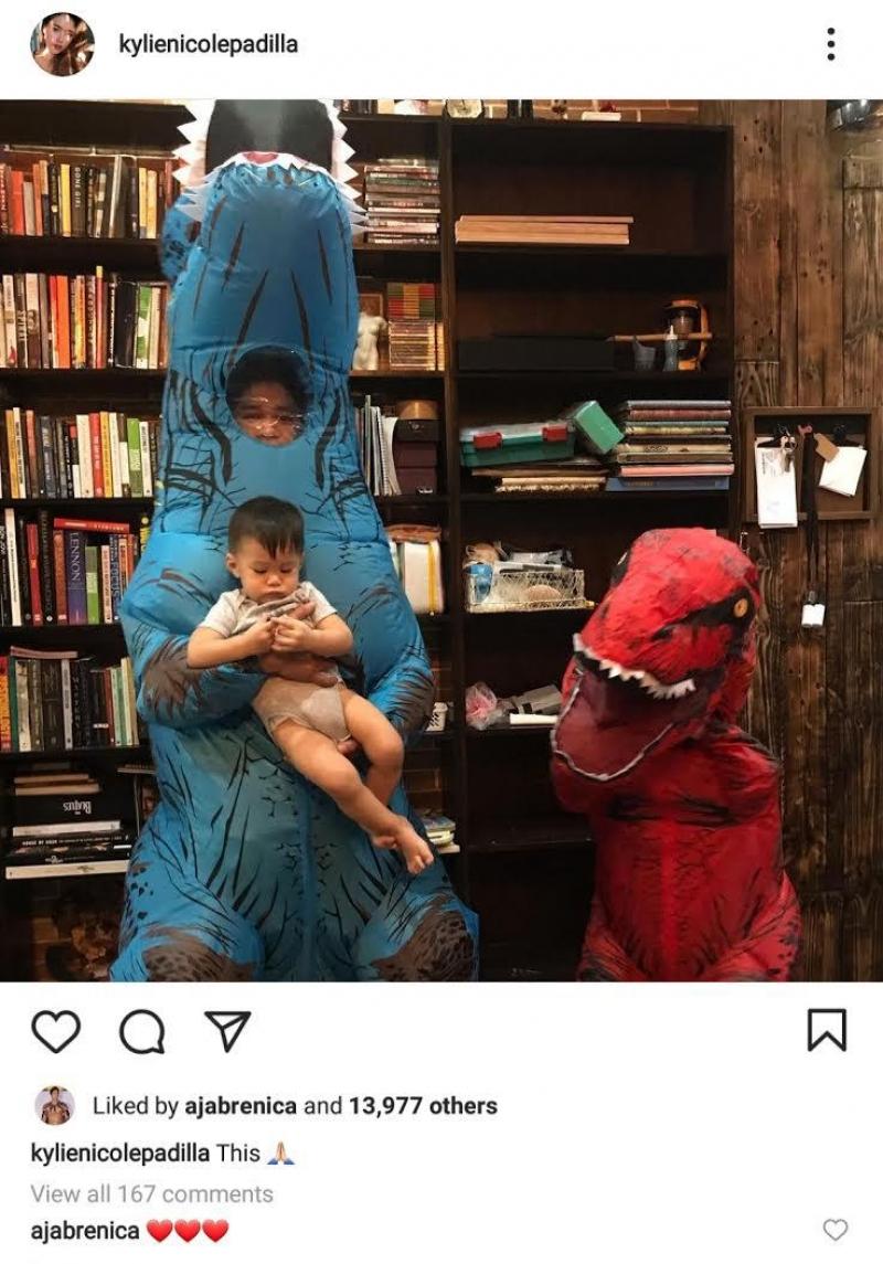 On Instagram yesterday, February 23, the Kapuso star posted a photo of her family -- with Aljur and Alas Joaquin wearing matching dinosaur costumes.