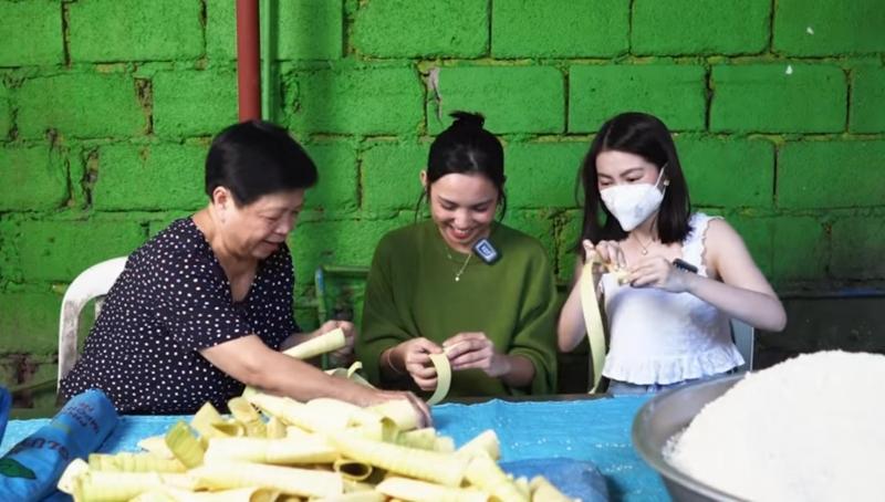 Sa tulong ng magsusumang si Aling Baby, nalaman ng dalawang aktres kung paano gumawa ng pambalot ng suman.
