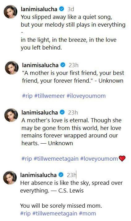Sa Isang serye ng Instagram post ay ipinaalam ni Lani kung gaano niya nami-miss at mami-miss ang kaniyang ina sa pamamagitan ng ilang litrato at quotes o mensahe niya para dito.