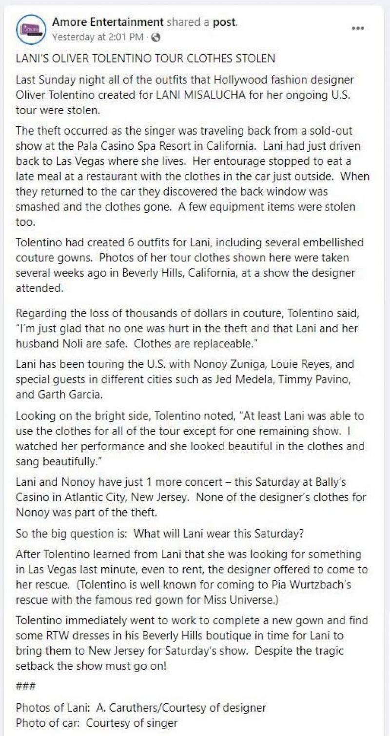 A post shared by Facebook user Amore Entertainment on the DC/MD/VA Filipino Americans Facebook page provided details on the robbery of couture costumes created by Filipino fashion designer Oliver Tolentino.