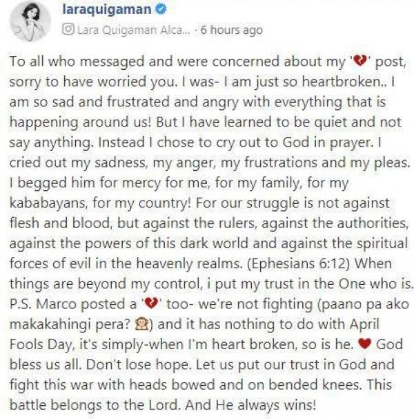 Lara Quigaman explained her cryptic broken heart post, talks about husband Marco Alcaraz.