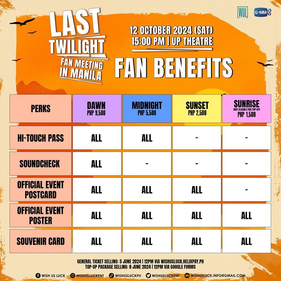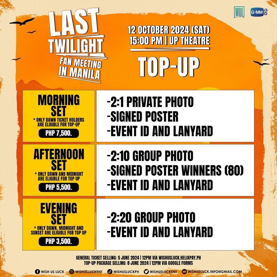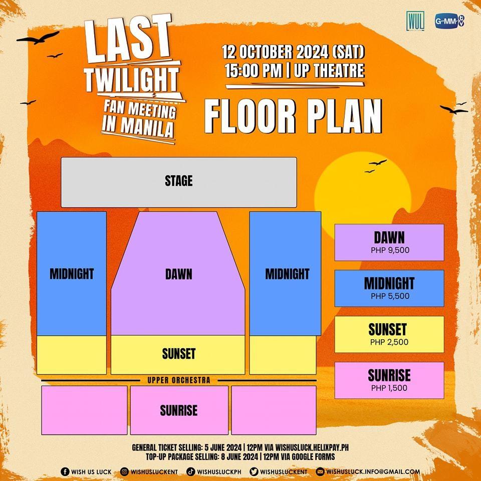 Tickets for the Last Twilight Fan Meeting in Manila 2024 are still available through the official Wish Us Luck Ticketing Site. Don't miss your chance to see these talented stars live on October 12, 2024, at UP Theater!