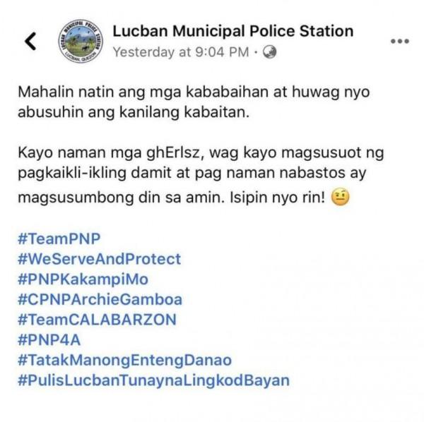 According to the now-deleted post and page, “Kayo namang mga gherlsz, 'wag kayo magsusuot ng pagkaikli-ikling damit at 'pag naman nabastos ay magsusumbong din sa amin. Isipin niyo rin.”