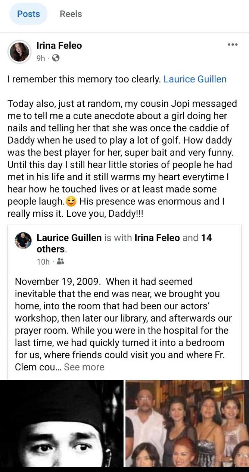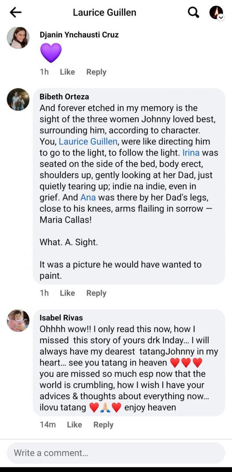 She wrote, "Forever etched in my memory is the sight of the three women Johnny loved best, surrounding him, according to character. You, Laurice Guillen, were like directing him to go to the light, to follow the light. Irina was seated on the side of the bed, body erect, shoulders up, gently looking at her dad, just quietly tearing up; indie na indie even in grief. And Ana was there by her dad's legs, close to his knees arms flailing in sorrow -- Maria Callas! What. A. Sight. It was a picture he would have wanted to paint.