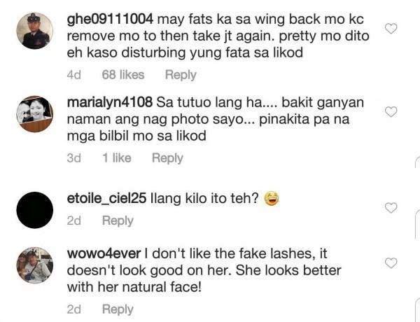 Saad ng isang netizen, “May fat ka sa wing back mo, KC. Remove mo 'to then take it again. Pretty mo dito, e, kaso disturbing 'yung fats sa likod.”