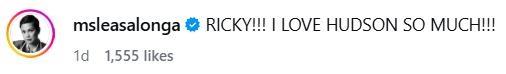 The Disney legend and Tony Award winner took to the comments section to voice her inner fangirl, writing in all caps: “RICKY!!! I LOVE HUDSON SO MUCH!!!”