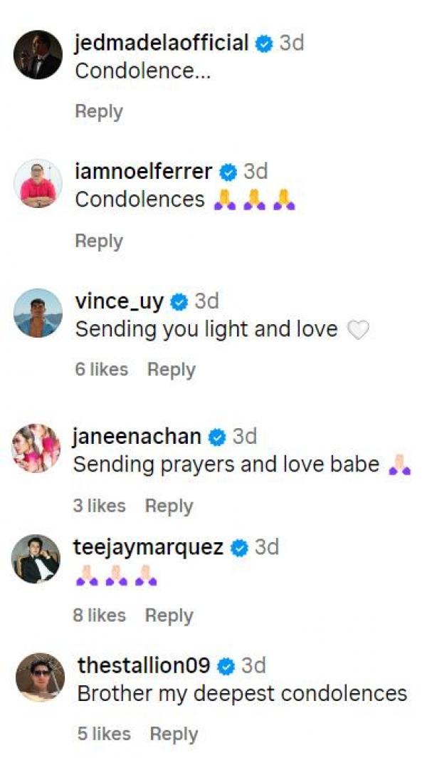 Several celebrities offered their condolences to Lharby's family amid this difficult point in their lives including Sparkle host Janeena Chan and actor Albie Casiño.