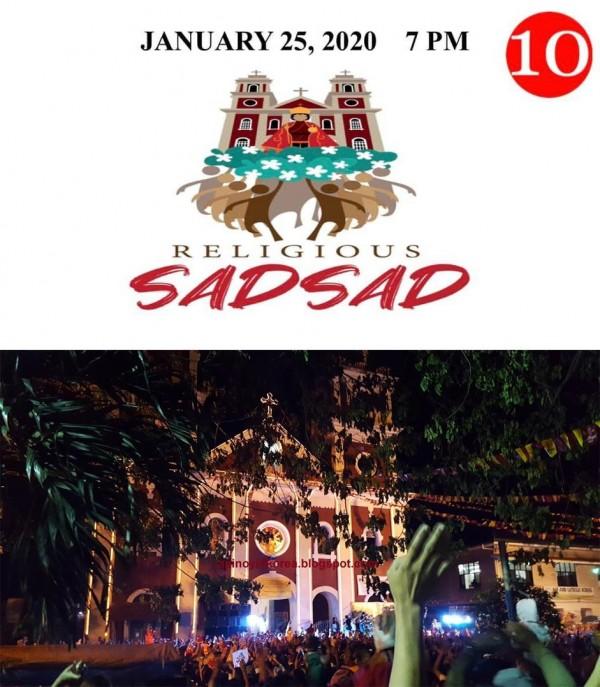 The religious sadsad is a devotion to the Sto. Niño done by chanting and dancing to rhythmic music while holding images of the Sto. Niño. It will be held at 7:00pm at the San Jose Parish Church, across Plaza Libertad.