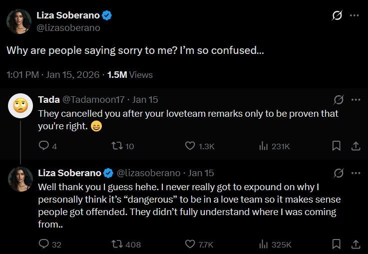 “Well, thank you, I guess hehe. I never really got to expound on why I personally think it's 'dangerous' to be in a love team, so it makes sense people got offended. They didn't fully understand where I was coming from...” Liza responded.