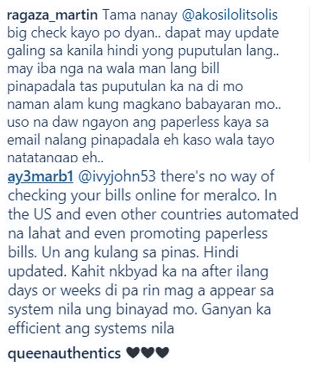 "Eh lalo na si Pokwang na may baby, naku 'di ang init ng bahay niya na walang electric fan man lang na magagamit. Sana naman may enough time silang ibigay bago magputol ng service. Actually nga iyon akin may over payment pa ako pero pinutulan pa rin. Ay naku, talagang at the mercy tayo ng mga kumpanyang ito, wala kang magawa sa kanilang mga procedure. #instatalk #lolitkulit #71naako."