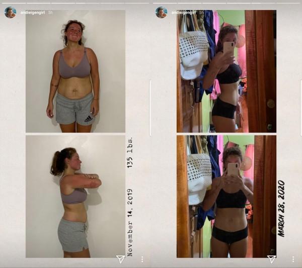 The mom of two compared the photos taken on November 14, 2019 when she still weighs 135 lbs and snaps from March 28, 2020.