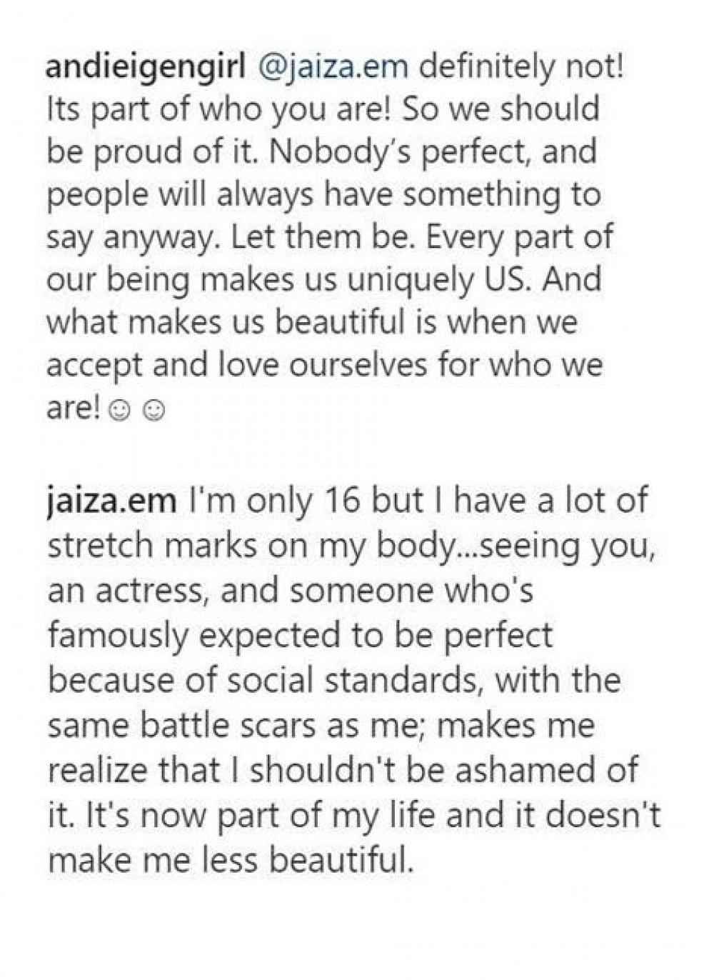 Andi Eigenmann encourages people with stretch marks, "It's part of who you are! So we should be proud of it."