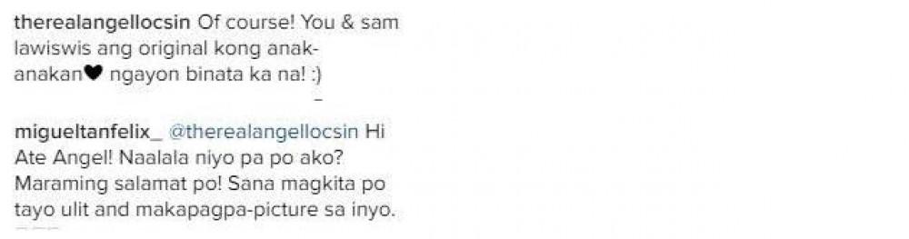 "Got a comment from Ate/Ms Angel Locsin @therealangellocsin on my pic with my brother. She remembers me! Na-excite ako! Thank you, Ate Angel! Teenager na po ang inyong kaibigang kwago na si Pagaspas," saad ni Miguel.
