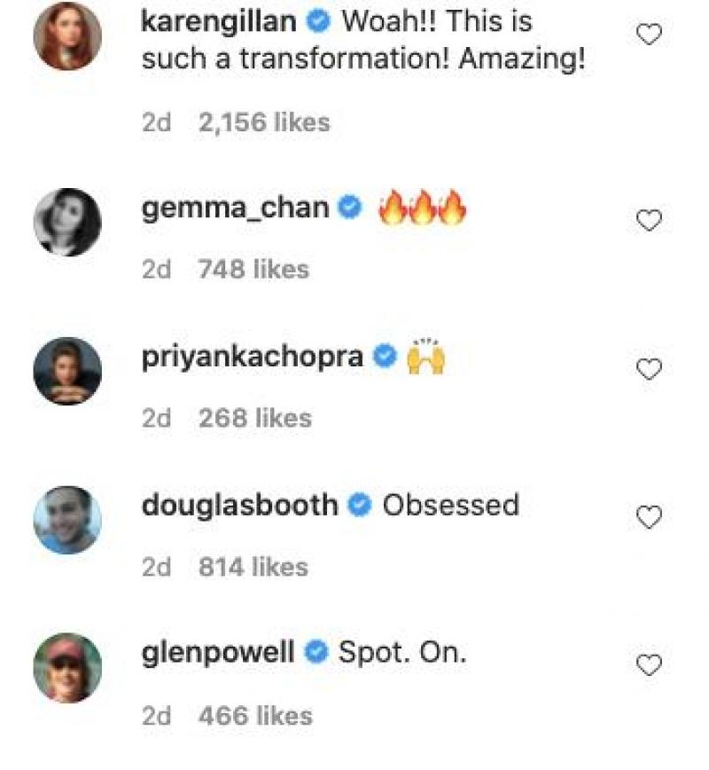 Avengers and Jumanji star Karen Gillan commented, “Woah!! This is such a transformation! Amazing!”