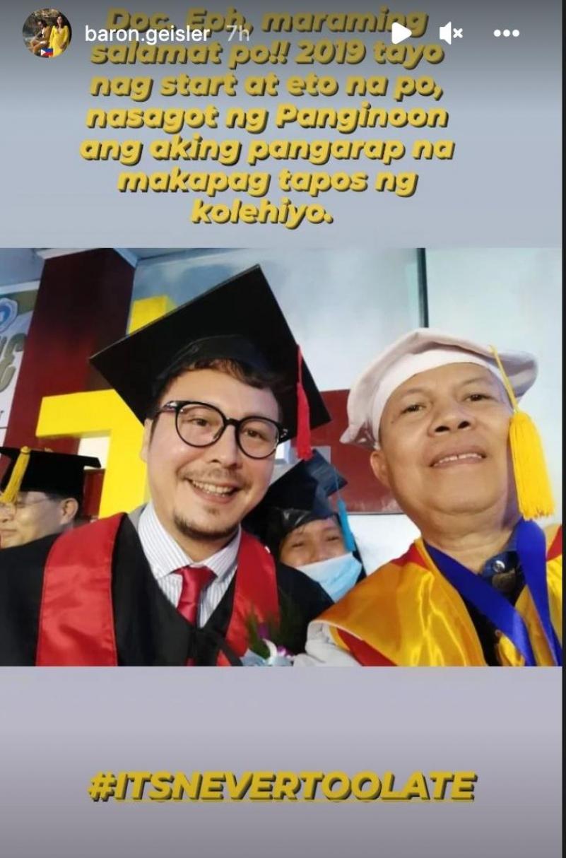 Isang panibagong achievement ang ibinahagi ng aktor na si Baron Geisler sa kanyang mga tagasunod dahil sa kanyang pagtatapos ng kolehiyo sa kursong Theology sa All Nations College sa Antipolo City.